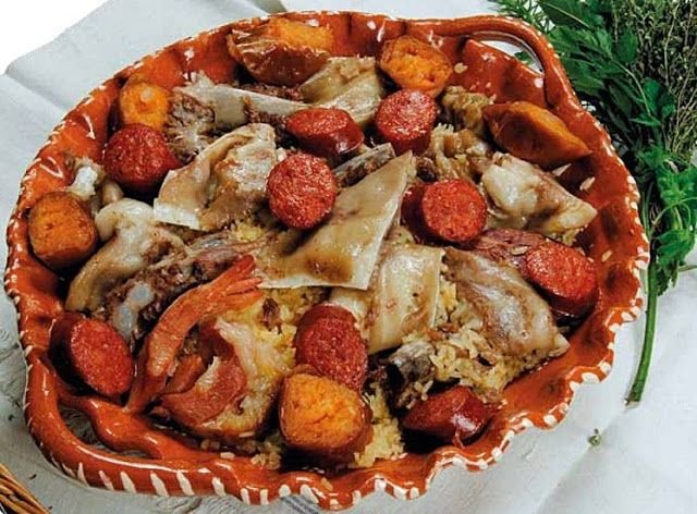 - Serve-se o arroz, que deve ficar húmido, enfeitado com os chouriços e as farinheiras cortados ás rodelas.