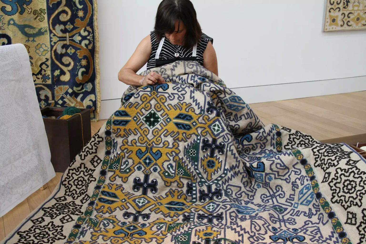 A terceira fase de trabalho é o preenchimento dos fundos que estão em volta dos motivos e desenhos. Para este trabalho emprega-se a lã da cor ou cores que, previamente, foram escolhidas para os fundos.